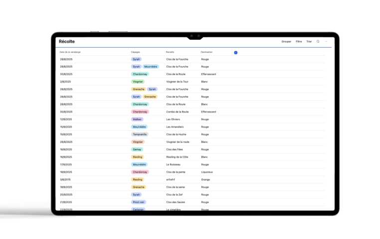 Ce scénario permet d’inscrire et de centraliser facilement les résultats des vendanges, afin d’assurer un suivi clair et structuré des récoltes.