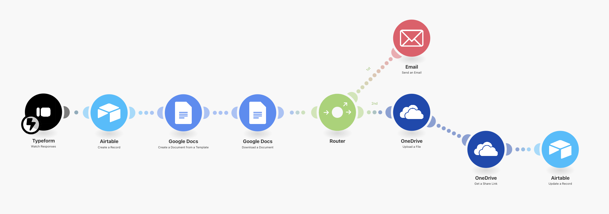 Pour répondre à ces besoins, un workflow automatisé a été conçu sous Make. Les ouvriers saisissent les informations de récolte directement depuis le vignoble via un formulaire Typeform. Ces données sont ensuite automatiquement transformées en rapport PDF, envoyé par e-mail au responsable de la cave. Parallèlement, elles sont stockées dans OneDrive pour consultation et archivées dans Airtable afin de garantir un suivi structuré et durable.